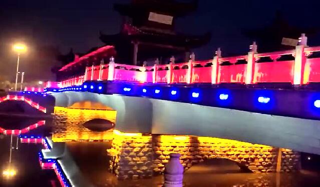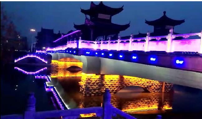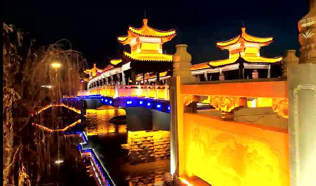 太平橋用隱藏式的瓦楞投光燈照亮建筑屋面,變幻四季顏色,絢麗多彩,形成一定的韻律感,河中倒影給人波光粼粼的勝境,整體氣勢恢弘,在橋的欄桿下一側用定制的祥云圖案燈順序排列,寓意祥和、太平,突出太平盛世文化。
